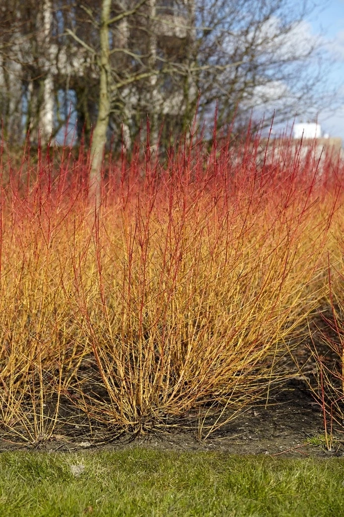 Cornus sanguinea ‘Midwinter Fire’ heeft in de winter prachtige oranje/rode takken.