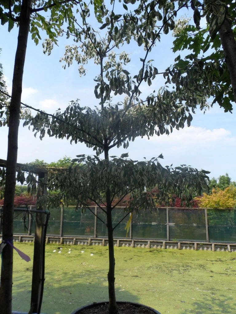 Cornus controversa ‘Variegata’ heeft wit gevlekte bladeren.